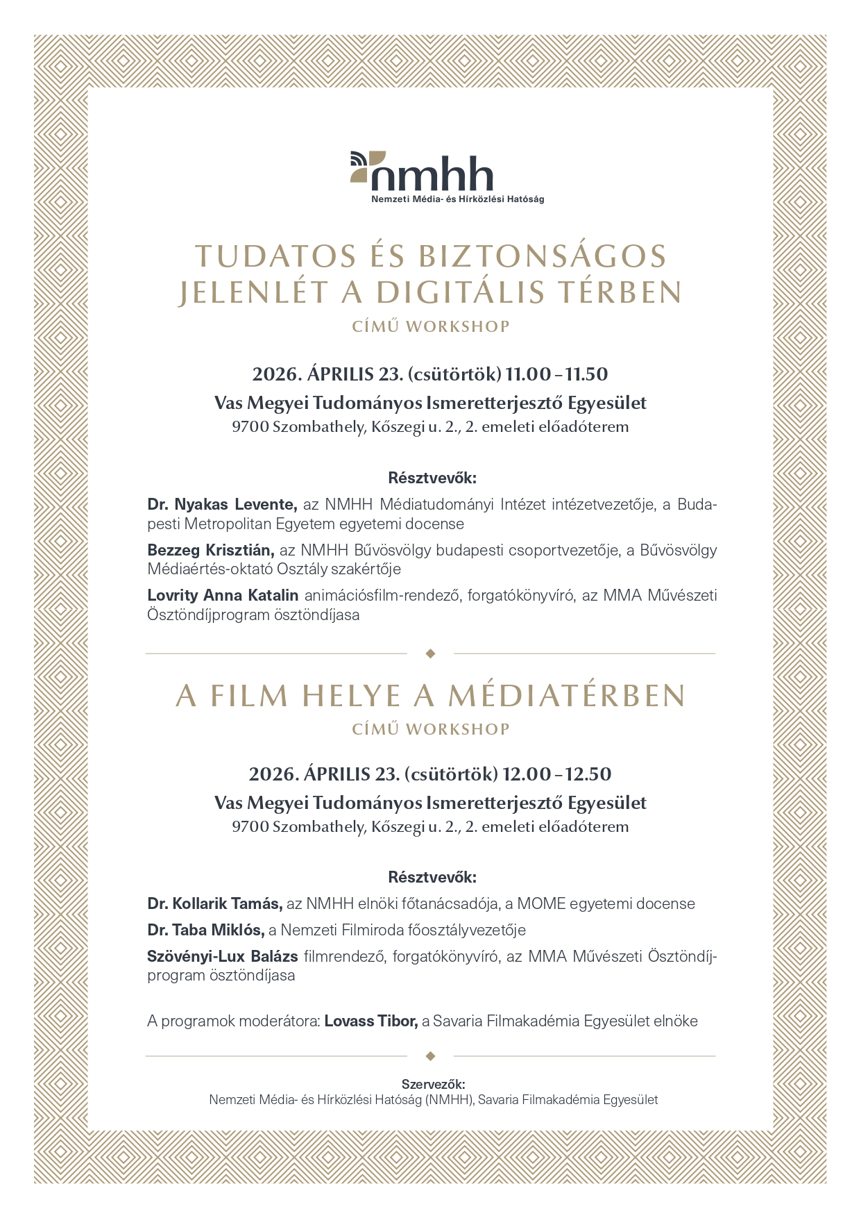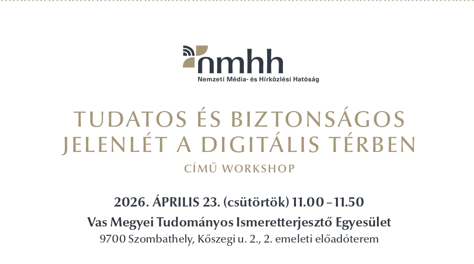 A workshopokon való részvétel ingyenes, azonban előzetes regisztrációhoz kötött, melyet 2026. április 22-én 10 óráig tehetnek meg az érdeklődők a rendezveny@nmhh.hu e-mail-címen. A szervezők minden érdeklődőt tisztelettel várnak a Vas Megyei Tudományos Ismeretterjesztő Egyesület előadótermében.