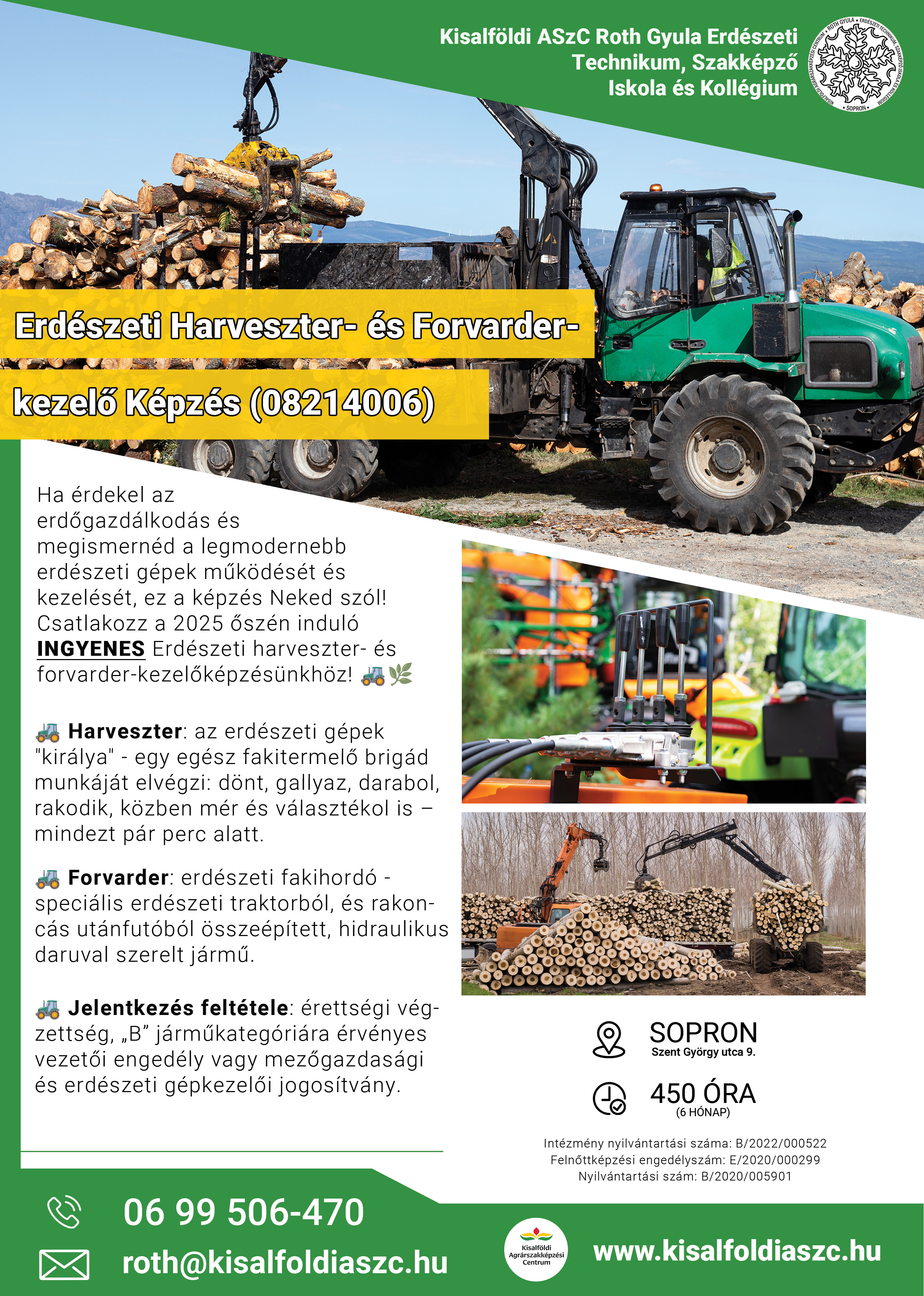 2025 őszén új, ingyenes erdészeti gépkezelő képzést indít a Roth Gyula Erdészeti Technikum.