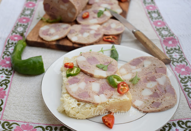 A szalonnát és a sonkát 1 cm-es kockákra vágjuk, összekeverjük a húsmasszával. Dupla rétegű fóliát kiterítünk, rápakoljuk a masszát, majd felcsavarjuk, a végeknél pedig többször átcsavarjuk, míg a rúd feszessé válik. A fóliavégeket alátűrjük, majd az egészet sütőpapírba csavarjuk és egy éjszakára hűtőben tároljuk.
