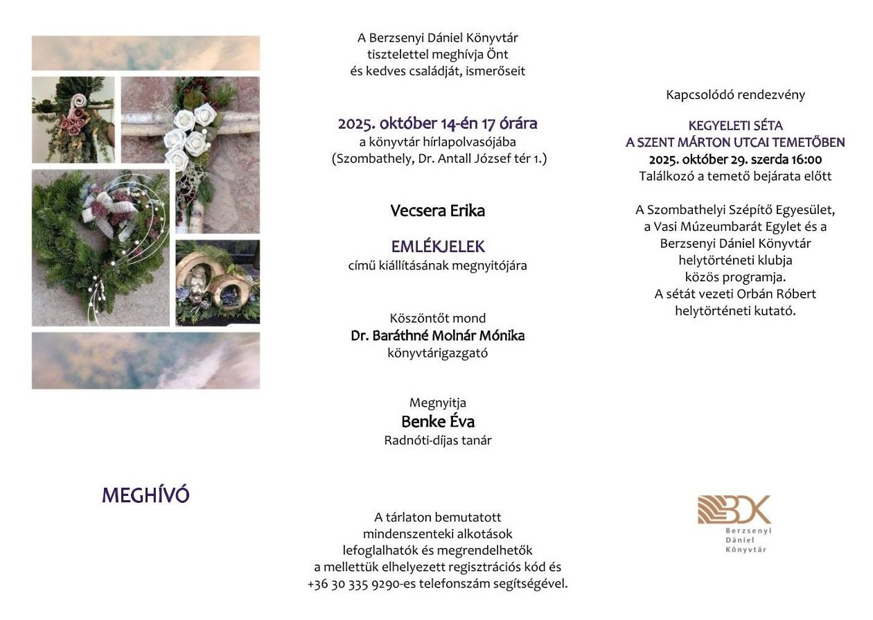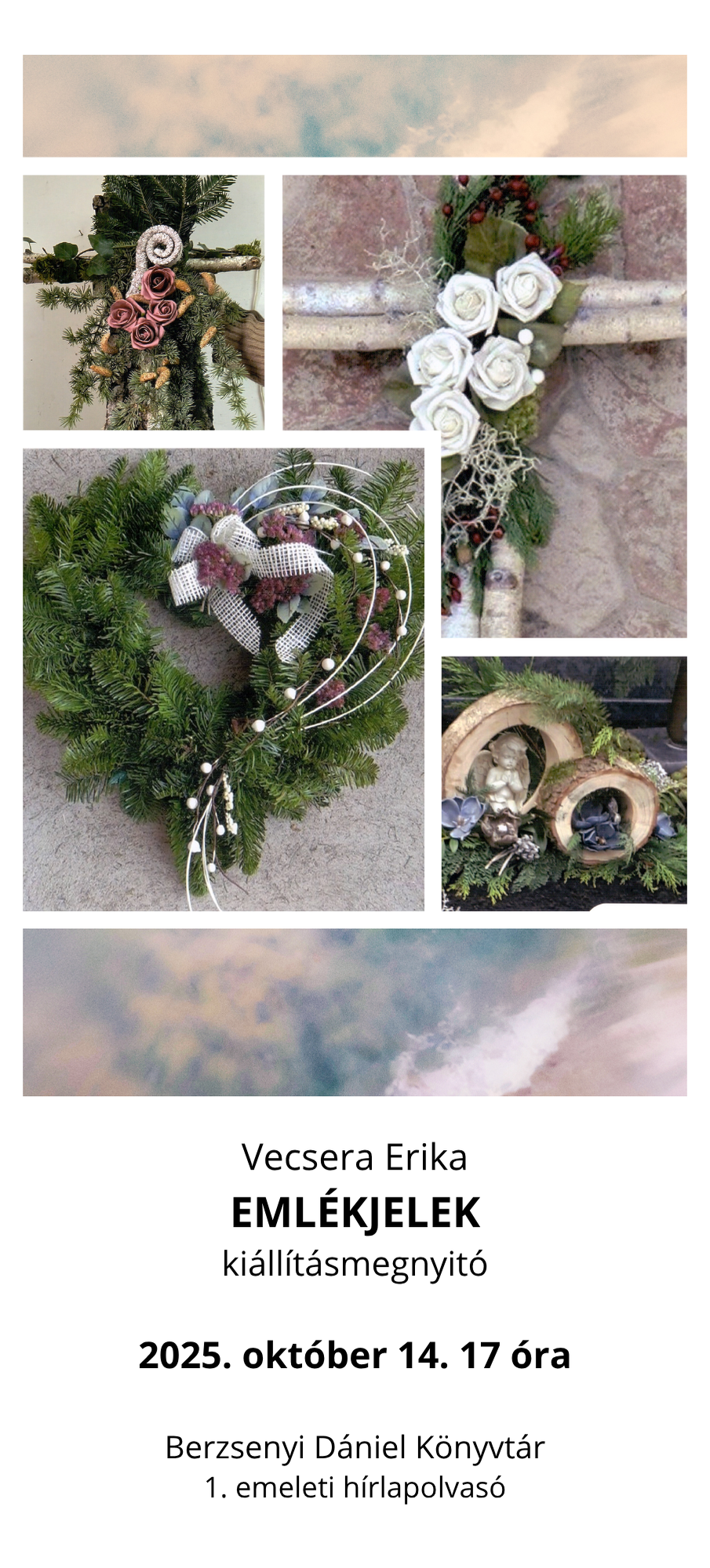 A Berzsenyi Dániel Könyvtár 2025. október 14-én 17 órától nyitja meg Emlékjelek című tárlatát, amely Vecsera Erika alkotásait mutatja be a könyvtár első emeleti hírlapolvasójában. A kiállítást dr. Baráthné Molnár Mónika, a könyvtár igazgatója köszönti, majd Benke Éva Radnóti-díjas tanár nyitja meg.