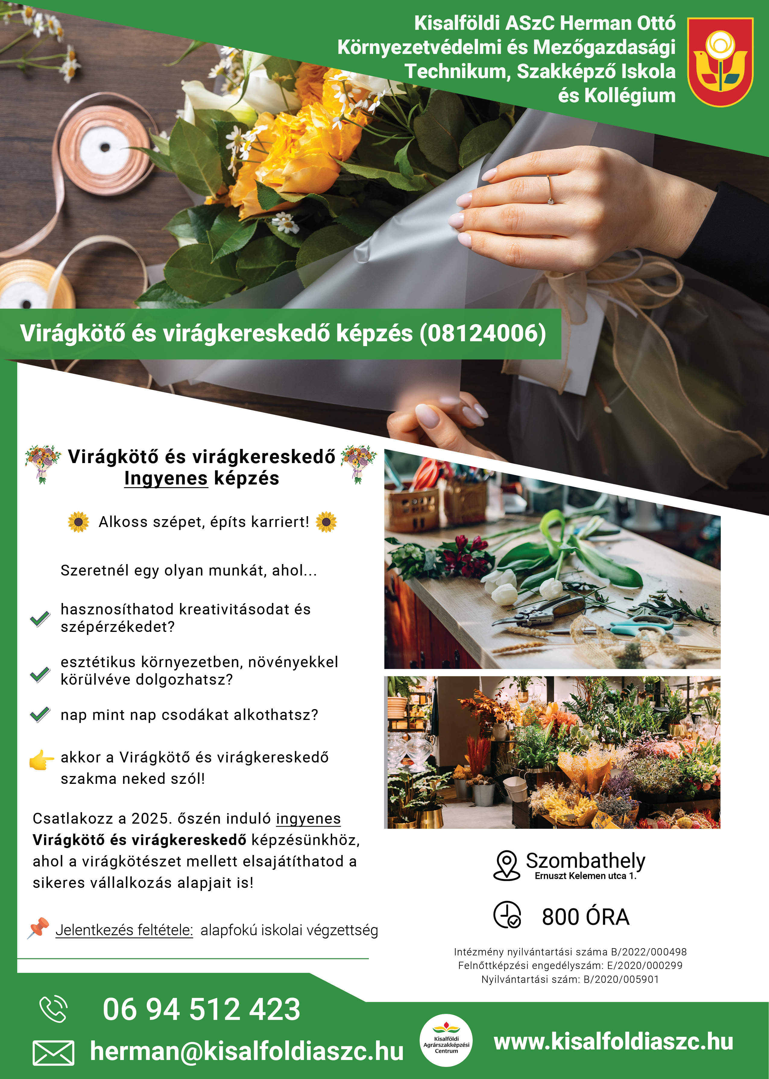 A Kisalföldi Agrárszakképzési Centrum Herman Ottó Környezetvédelmi és Mezőgazdasági Technikum, Szakképző Iskola és Kollégium új lehetőséget kínál azok számára, akik érdeklődnek a virágkötészet és virágkereskedelem iránt: ingyenes virágkötő és virágkereskedő képzés indul Szombathelyen.