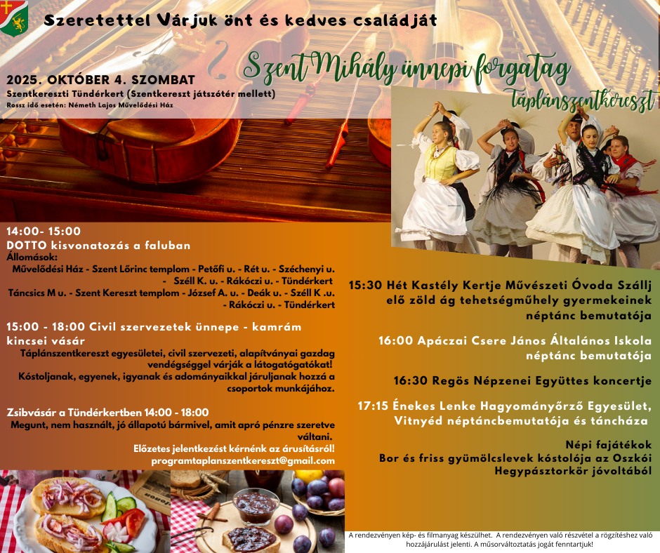 Ebben az évben október 4-én kerül sor Táplánszentkereszten a Szent Mihály napi forgatagra, amely a Szentkereszti Tündérkertben (a játszótér mellett) kerül megrendezésre, rossz idő esetén pedig a Németh Lajos Művelődési Ház ad otthont a színes családi programnak.