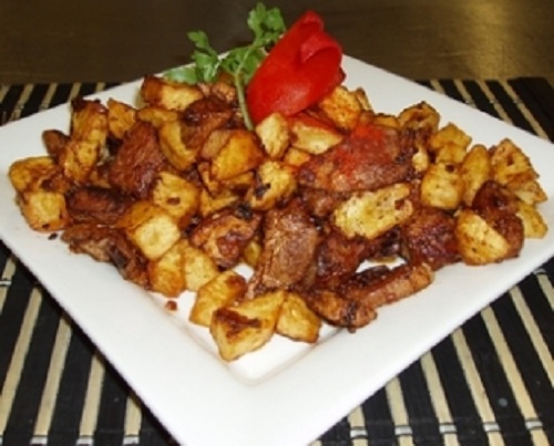 A hagymát és a fokhagymát meghámozzuk, a hagymát karikára, a fokhagymát vékony szeletekre vágjuk.Megpirítjuk a szalonnát, hozzáadjuk a hagymát és a fokhagymát, és fedő alatt megfonnyasztjuk. Hozzáadjuk az előkészített húst, majd 2-3 percig erős tűzön pirítjuk, és megszórjuk a majoránnával, ízlés szerint sózva, borsozva, majd lassú tűzön, fedő alatt puhára pároljuk. Ha a leve elfőne, kevés meleg vízzel vagy húslevessel pótolhatjuk.