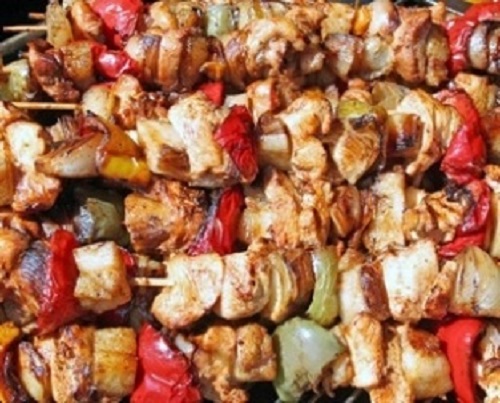 A húsokat kétujjnyi vastagságú darabokra vágjuk, azokat sózzuk és borsozzuk. A vöröshagymát négybe vágjuk, a szalonnát nagyobb szeletekre nyessük, a gombát megmossuk. A nyársra egyenként felhúzzuk a hozzávalókat, és parázs fölött megsütjük.