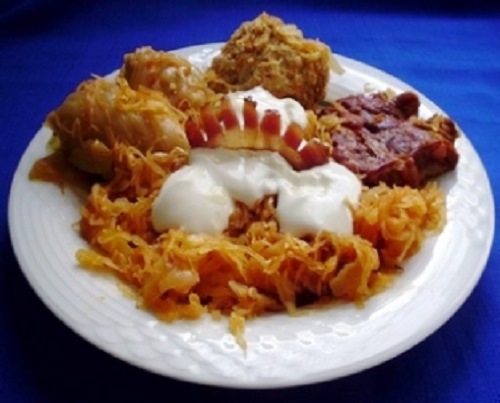 Egy nagyobb edénybe beletesszük a szalonna felét és zsírjára sütjük, ezután kiszedjük és félretesszük. Ebben a zsírban megpároljuk a vöröshagymát, majd a felét kivesszük és azt isfélretesszük. A maradék hagymát megszórjuk pirospaprikával, és felöntjük egy pohár vízzel. Ezt követően eltesszük a savanyú káposztának a felét és jól összekeverjük.