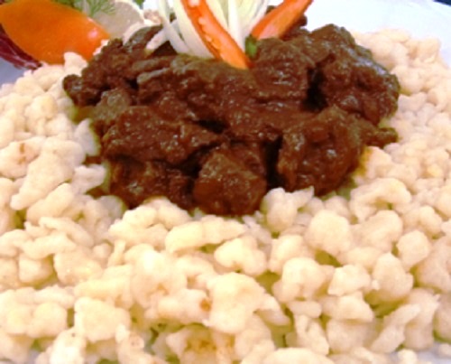 Erre a célra a marhahús lágyrészeit használjuk, mert az puhább: lapocka, lábszár, a bélszín vége. Jó, ha vegyes részekből készül és van benne vese, meg máj is. A húst hártyáitól jól megtisztítva, kockákra feldaraboljuk. Egy fej hagymát karikára vágva olajban üvegesre sütünk, megszórjuk édes-nemes paprikával és a húst hozzáadva pár percig sütjük, azután vizet öntünk rá, annyit, hogy elfedje és fedő alatt csendesen, kb. 2 óráig pároljuk. Közben adunk hozzá zöldpaprikát, télen paradicsomlevet.