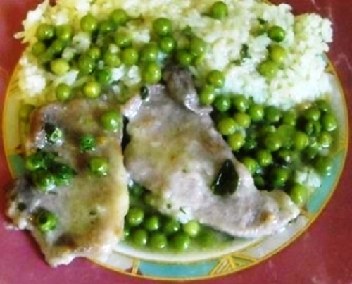 A zöldborsót olajban megpároljuk, a húshoz öntjük. Ha szükséges vizet öntünk alá, hogy elég bő leve legyen és a zöldborsóval még pár percig összefőzzük. Zöldpetrezselyemmel meghintjük.
