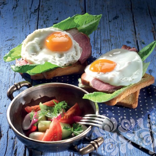 A kenyérszeleteket megpirítjuk, és mindegyikre egy-egy szelet salátalevelet és sonkát fektetünk, majd a tükörtojás rácsúsztatjuk.Kívánság szerint tálaláskor reszelt sajttal megszórhatjuk.