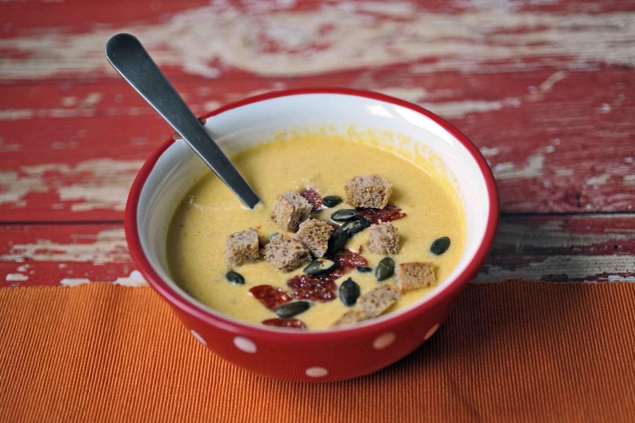 Sörös sajtleves pirított tökmaggal, kolbász chipsszel, rozskenyér kockákkal