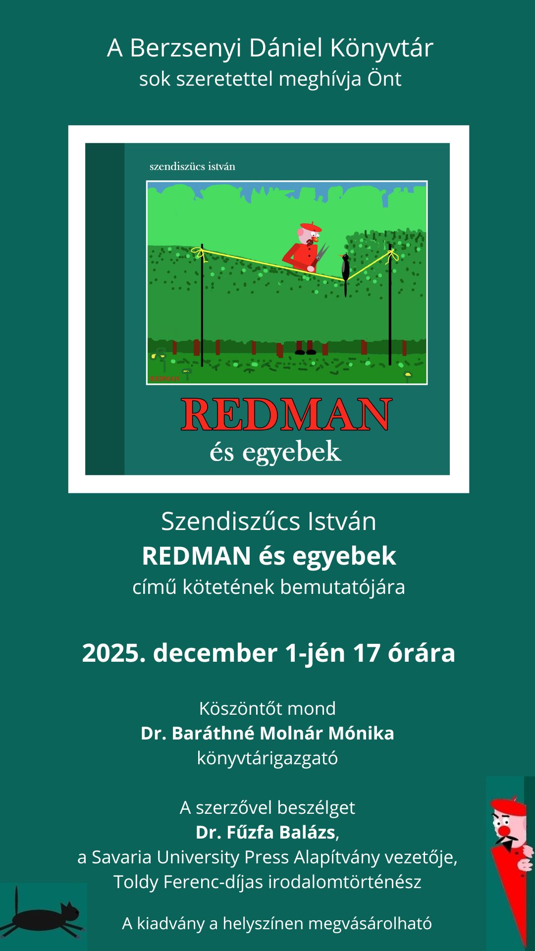 A Berzsenyi Dániel Könyvtár újabb kulturális programmal várja az érdeklődőket: 2025. december 1-jén, hétfőn 17 órakor mutatják be Szendiszűcs István képzőművész „REDMAN és egyebek” című kötetét a könyvtár földszinti előadótermében.